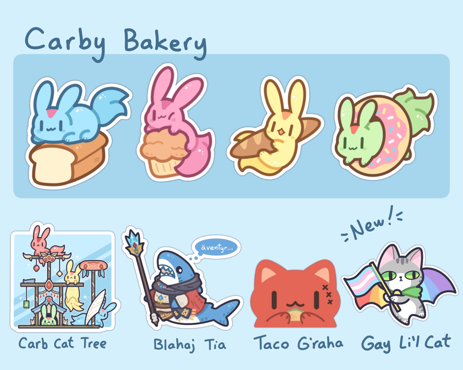 - Carby Bakery stickers have a matte finish; all others have a glossy finish.